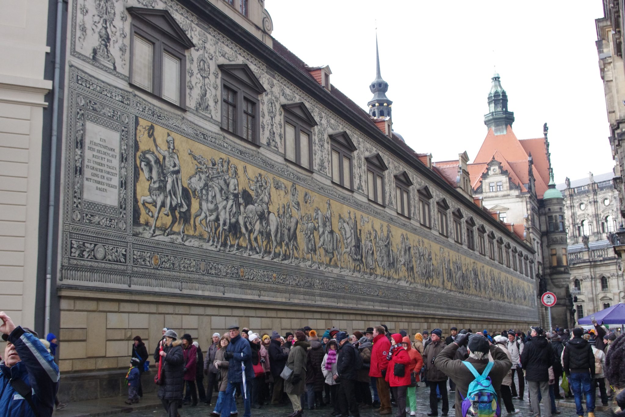 Najbardziej imponujące malowidło w mieście znajduje się jednak… na dworze. Dosłownie i w przenośni bo można je oglądać na ścianie gmachu dawnej rezydencji królów saskich. Obraz ma ponad 100 metrów długości i namalowano go na… kafelkach z miśnieńskiej porcelany. Nosi tytuł „Orszak książęcy” i przedstawia konne wizerunki władców Saksonii: margrabiów, hrabiów, książąt i królów. Jakimś cudem cała instalacja przetrwała bombardowanie w 45 r., tracąc jedynie 223 płytki z ponad 25 tysięcy, które odnowiono zaraz po wojnie. Jego przetrwanie musiało mieć duży wpływ na morale mieszkańców którzy po wojnie odbudowywali zniszczone miasto.