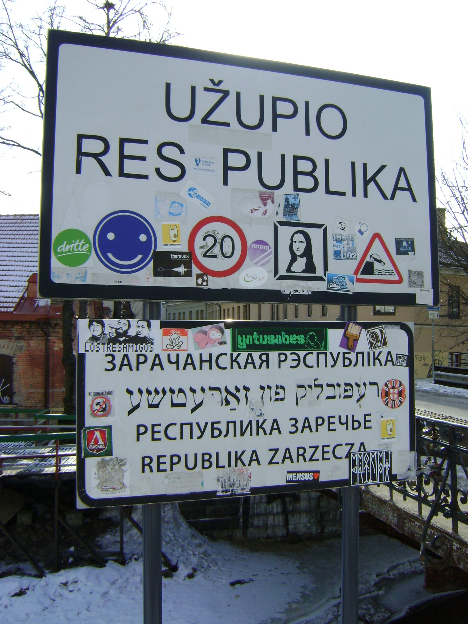 Kiedy szukałem schronienia przed pogodą niespodziewanie wyrosła przede mną… granica państwowa. Z pewnym zdumieniem popatrzyłem na żyjące własnym życiem za sprawą nalepek i graffiti znaki nie znanej mi zupełnie organizacji państwowej. Wszystko wyjaśniło się kawałek dalej za pomocą wyrytej na specjalnych tablicach w kilku językach (w tym po polsku) konstytucji… Zarzecza. Dość humorystycznej w treści… Republika Užupio, bo tak oficjalnie się nazywa, narodziła się w 1997 roku za sprawą lokalnej bohemy artystycznej i choć ciężko traktować ją poważnie, to posiada wszystkie niezbędne elementy samodzielnego państwa w tym prezydenta, rząd, flagę, armię, hymn a nawet biskupa. Obszar republiki zajmuje tereny dawnej dzielnicy żydowskiej, położonej na prawym brzegu rzeki Wilejki. Przez wiele lat była zaniedbana, ale obecnie przeżywa drugą młodość i ma swoich wiernych fanów na całym świecie.