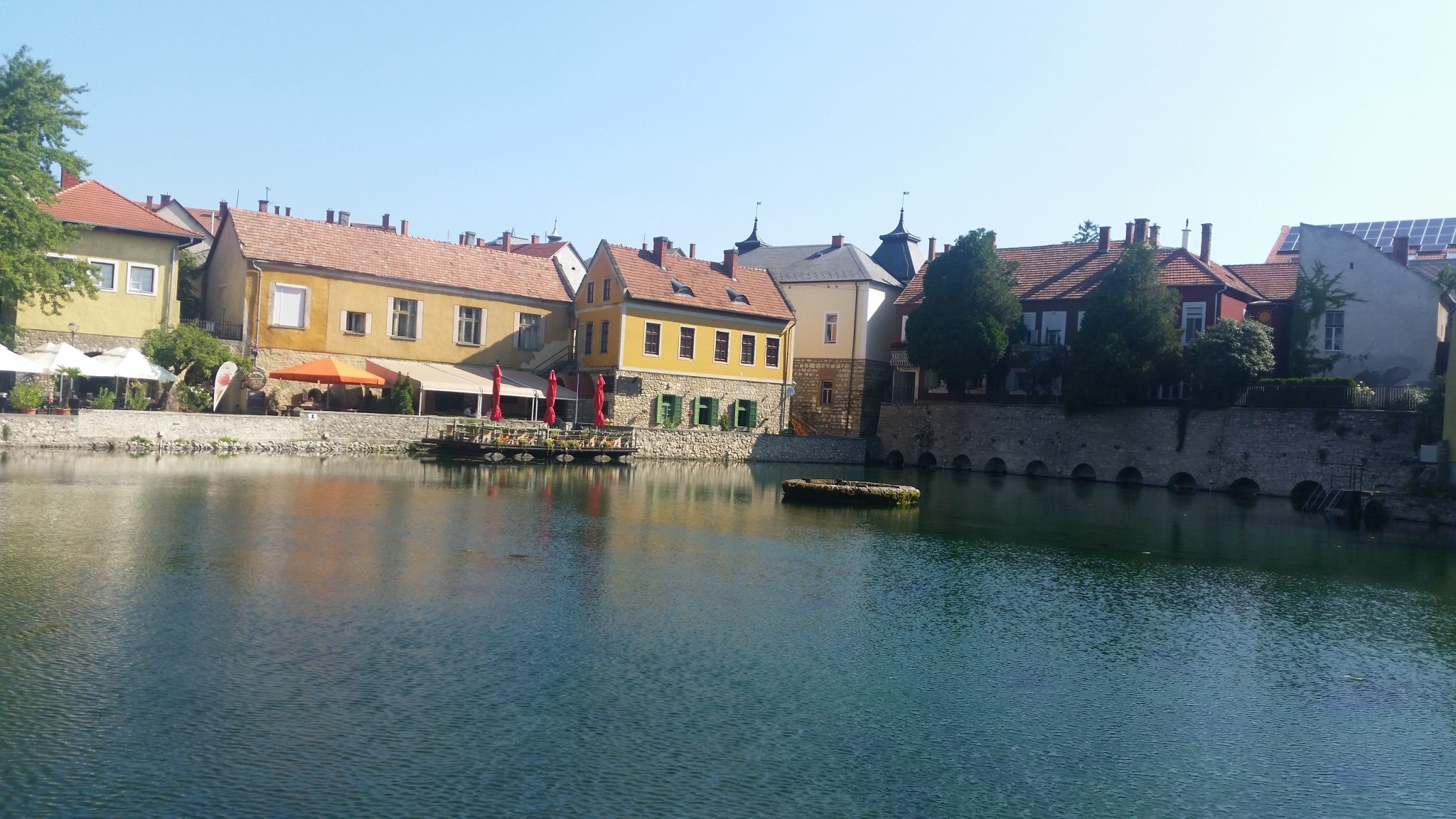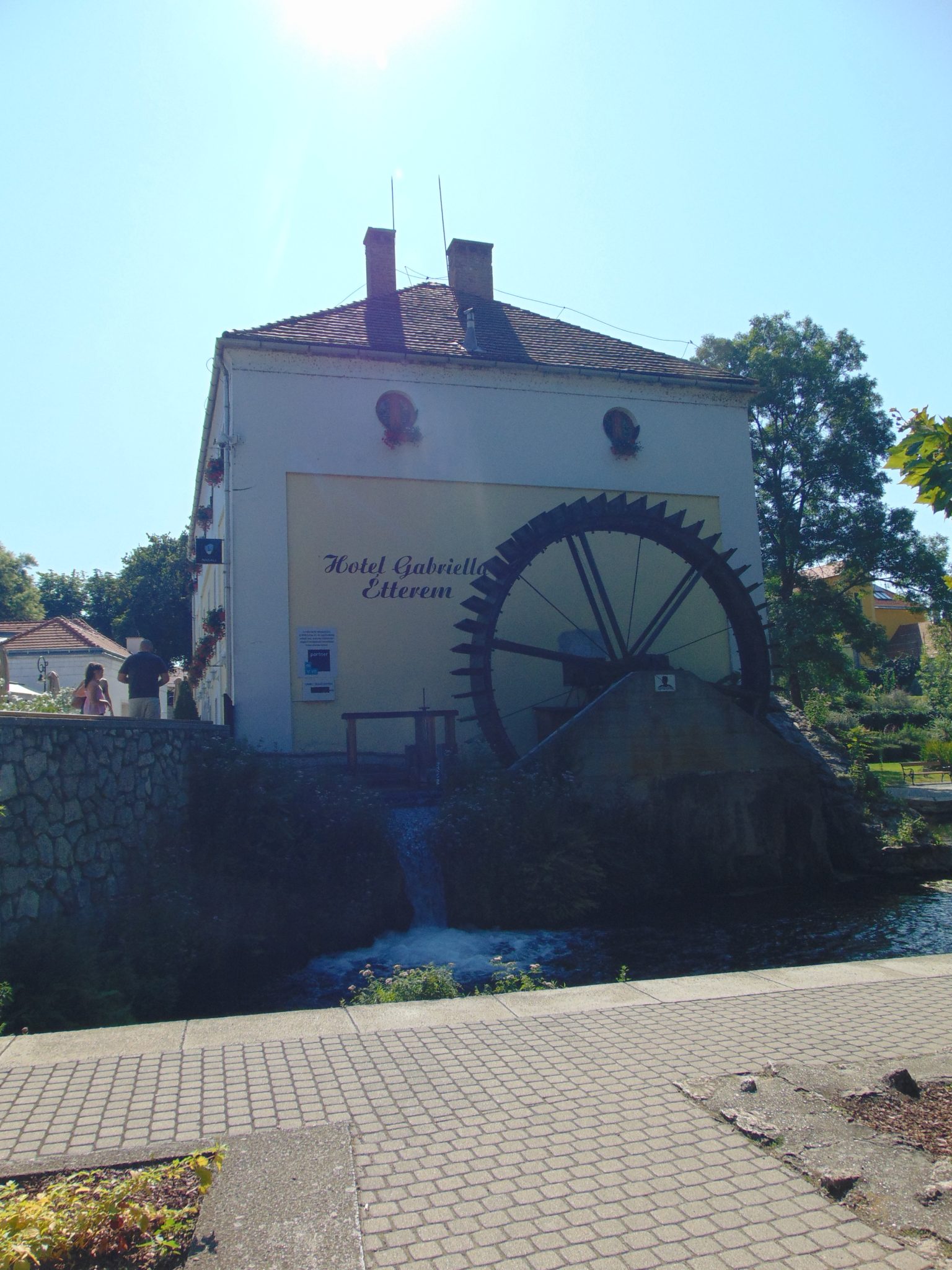 Mimo krótkiego dystansu zdążyliśmy nawet zrobić jeszcze postój. Przejeżdżając przez miejscowość Tapolca, tak nam się spodobało że postanowiliśmy zostać chwilę dłużej, a nawet pozwiedzać. Zachwyciła nas zwłaszcza starówka położona nad niedużym stawem młyńskim. Młyn już nie funkcjonował w swojej pierwotnej formie – przerobiono go na luksusowy hotel. Aczkolwiek zachowano dawne elementy infrastruktury z ogromnym kołem wodnym na czele. W stawie pływały również kolorowe rybki które można było karmić.