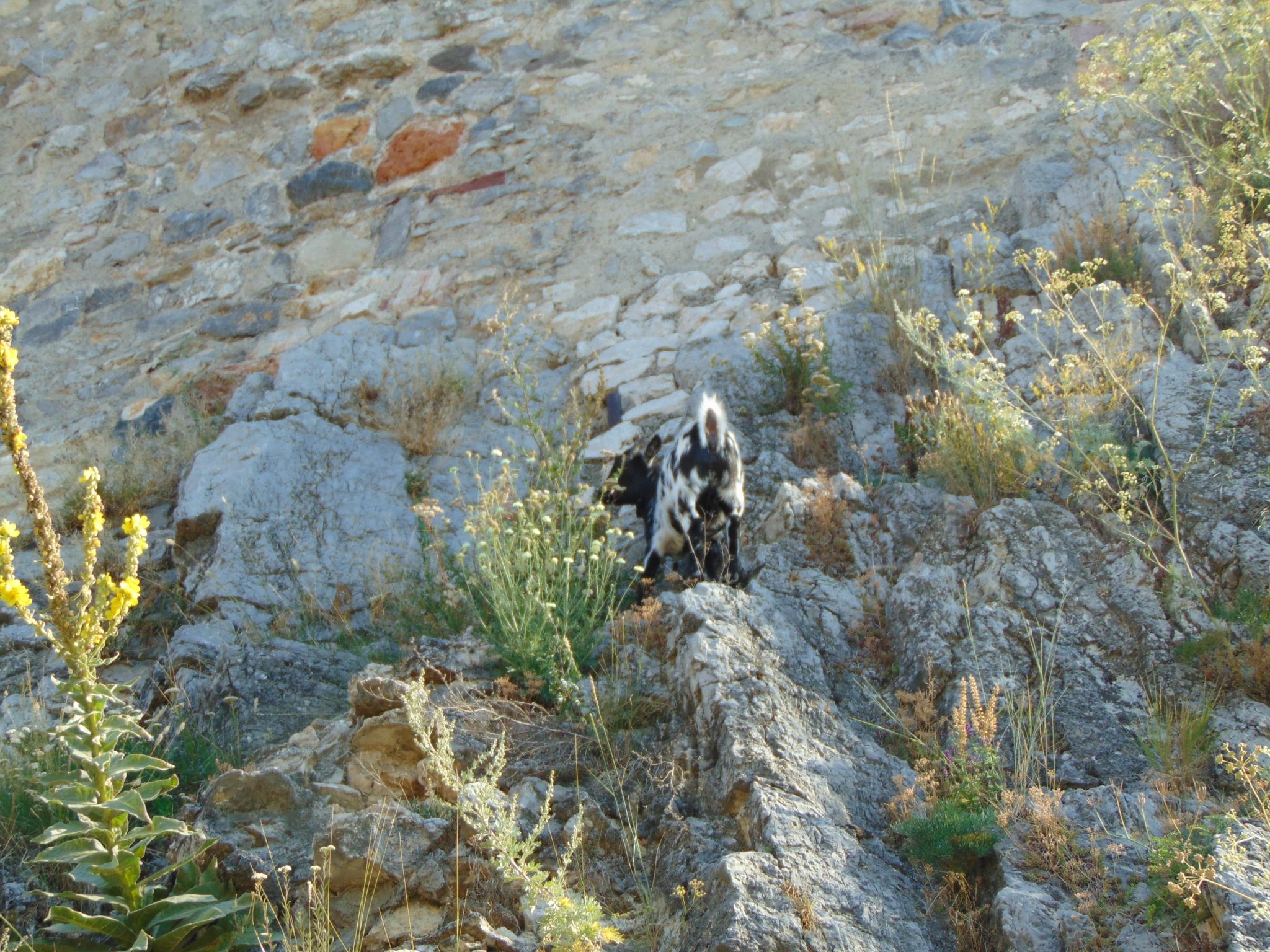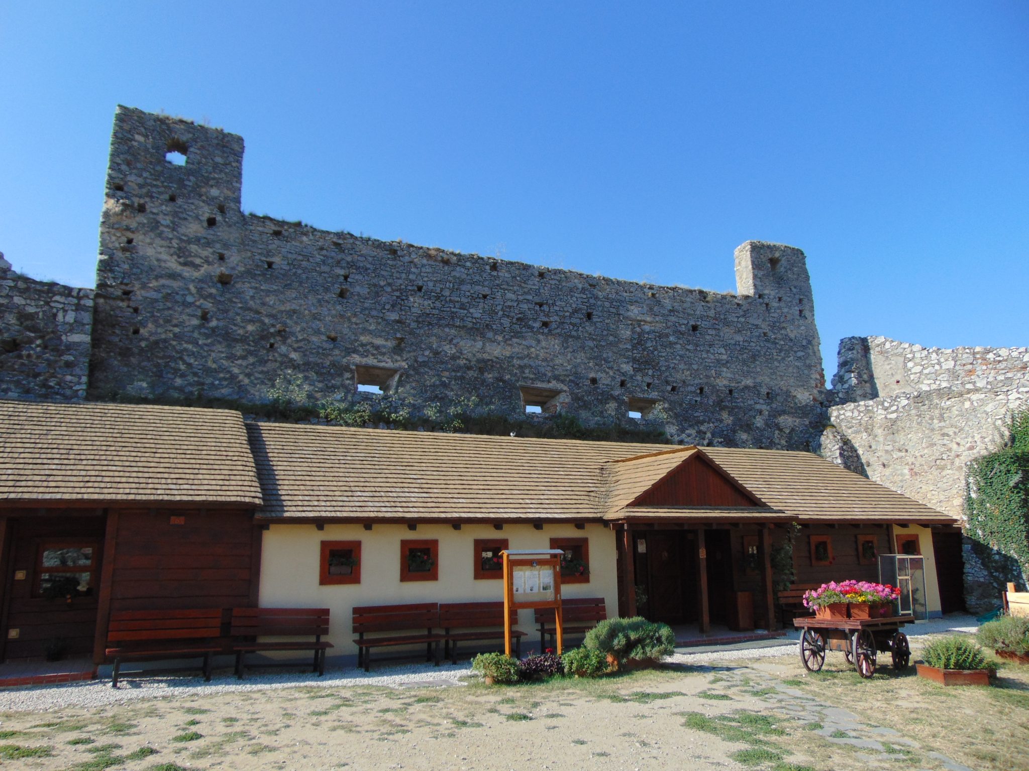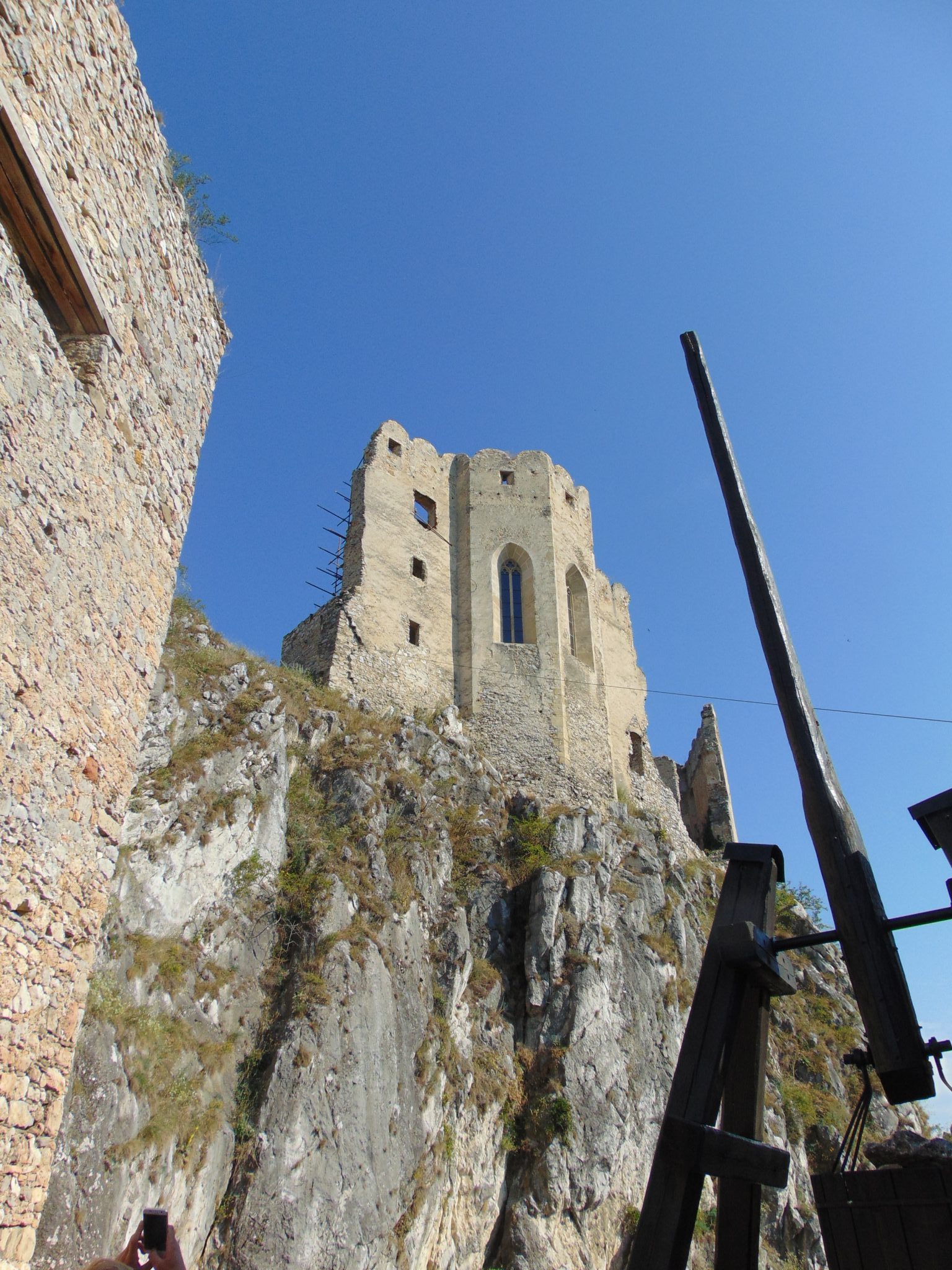 Zamek zbudowany został najprawdopodobniej w XIII w., choć tradycje obronne wzgórza sięgają czasów rzymskich. Długi czas miał status niezdobytego, niestety pod koniec XVII w. ze względu na rozwój artylerii stracił na znaczeniu i został opuszczony. Gwoździem do trumny był pożar pod koniec XVIII w., który doszczętnie strawił dachy. Od tego czasu systematycznie niszczał i nikt nie interesował się nim aż do lat 70 XX w. Rozpoczęto wówczas prace konserwatorskie które trwają w zasadzie do dzisiaj. Nie planuje się całkowitej odbudowy. Może to i lepiej. Oprócz samych ruin, można tutaj zobaczyć wiele rekonstrukcji uzbrojenia średniowiecznego, w tym ciężkie machiny oblężnicze. Nieco życia nadaje ruinom żywy inwentarz w postaci stadka kaczek i gęsi. Najbardziej spodobały nam się jednak kozy, które skakały sobie po niemal pionowych skałach i skubały pojedyncze krzaczki. W końcu z pewnym żalem opuściliśmy malownicze ruiny. Po drodze obejrzeliśmy jeszcze położoną u podnóża zamku żydowską nekropolię.