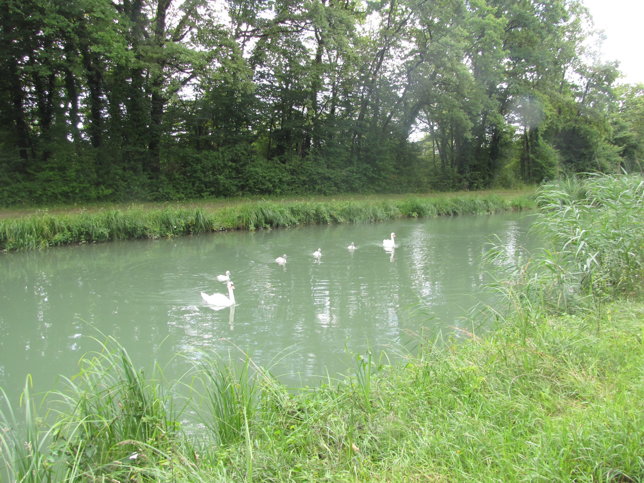 W końcu znalazłem ścieżkę rowerową biegnącą wzdłuż kanałów. Tutaj już nie dało się zabłądzić. Droga do Sztrasburga była już prosta jak drut. Wiązało się to jednak z pogłębiającą monotonią krajobrazu. Tym bardziej że po kanale nic nie pływało – poza szczurami i pewnie nie były to szczury lądowe… No dobra, czasem wylądowała też grupa łabędzi. Ścieżka była jednokierunkowa, więc jedynym urozmaiceniem było przejechanie z jednego brzegu na drugi.
