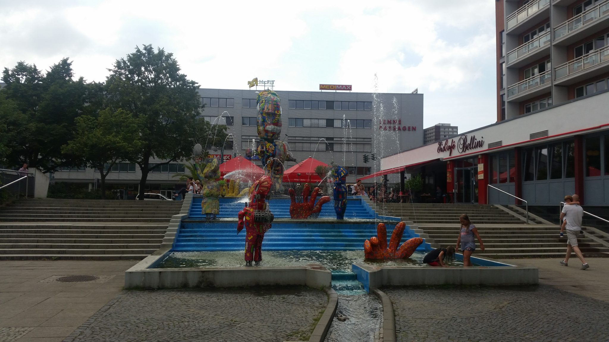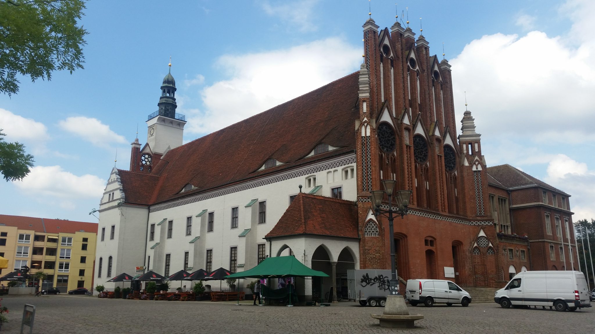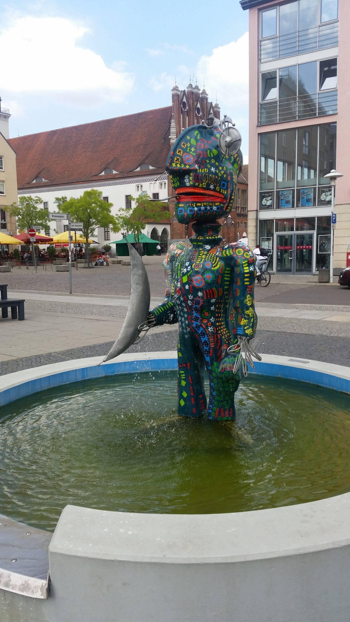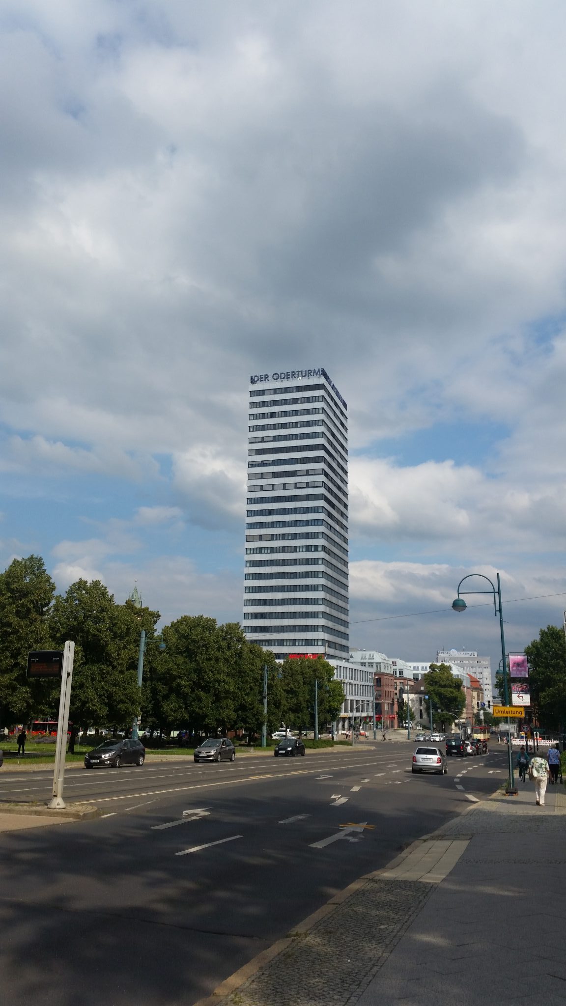 Im bliżej granicy tym jednak robiło się przyjemniej. Ruch był niewielki więc zjechałem na asfalt, którym dojechałem aż do Frankfurtu nad Odrą. Nigdy przedtem w nim nie byłem. Po wcześniejszych wizytach w Goerlitz, spodziewałem się kolejnego wyludnionego miasta-widma, ale jak się okazało nie było aż tak źle. Owszem nie zabrakło kilku malowniczych pustostanów, ale większość nie sprawiała wrażenia opuszczonych. Dobre wrażenie robił też symbol miasta – Oderturm, najwyższy wieżowiec w okolicy (88,95 m). Starówka nie była taka ładna, ale miała swój urok i dużo kolorów. Podobały mi się też liczne fontanny. Dość ekscentryczne nawet bym powiedział. Zupełnie inne od tego co przyzwyczaiłem się w innych częściach Niemiec.