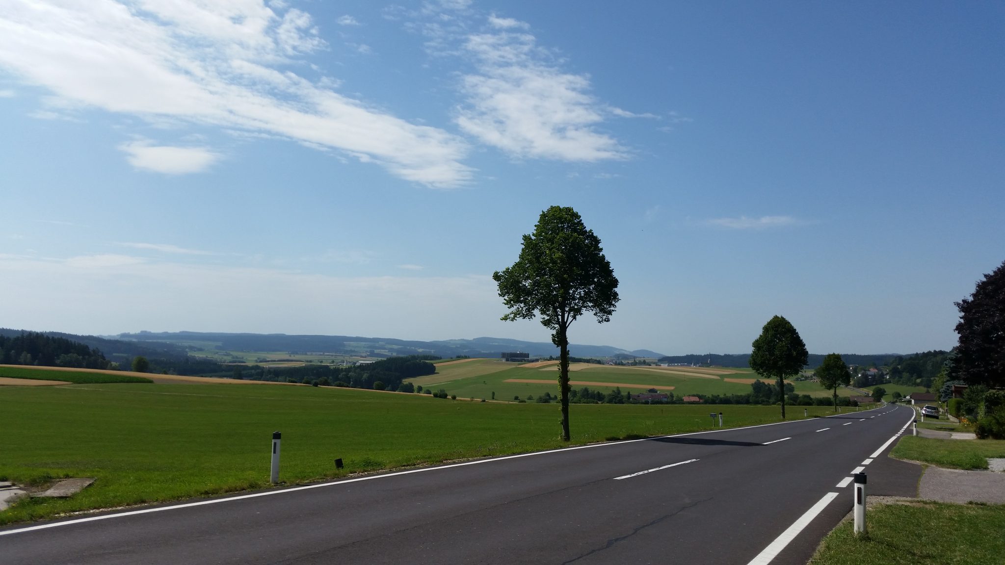Podjazd był dość ciężki, w końcu wspiąłem się na wysokość około 800 m.n.m.p. Niby niedużo, ale jadąc z tobołami daje nieco w kość. Potem pokonałem całkiem malowniczy płaskowyż i niedługo potem zaczęła się ostra jazda w dół. Niby przestudiowałem wykresy itp., ale takiej stromizny się nie spodziewałem; a przecież to jeszcze nie Alpy… Z trudem panowałem nad rowerem, a przy ostrych zakrętach równie ostro hamowałem, piłując niemiłosiernie klocki (z tarczówkami byłoby pewnie łatwiej, ale niestety nie mogę ich zamontować na moim Pegasusie z przyczyn technicznych) i zatrzymując się na każdej możliwej zatoczce autobusowej. W końcu z duszą na ramieniu (w sumie ponad 500 metrów poniżej) wylądowałem nad Dunajem.