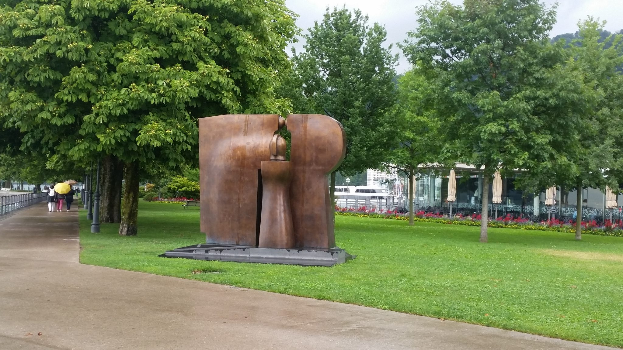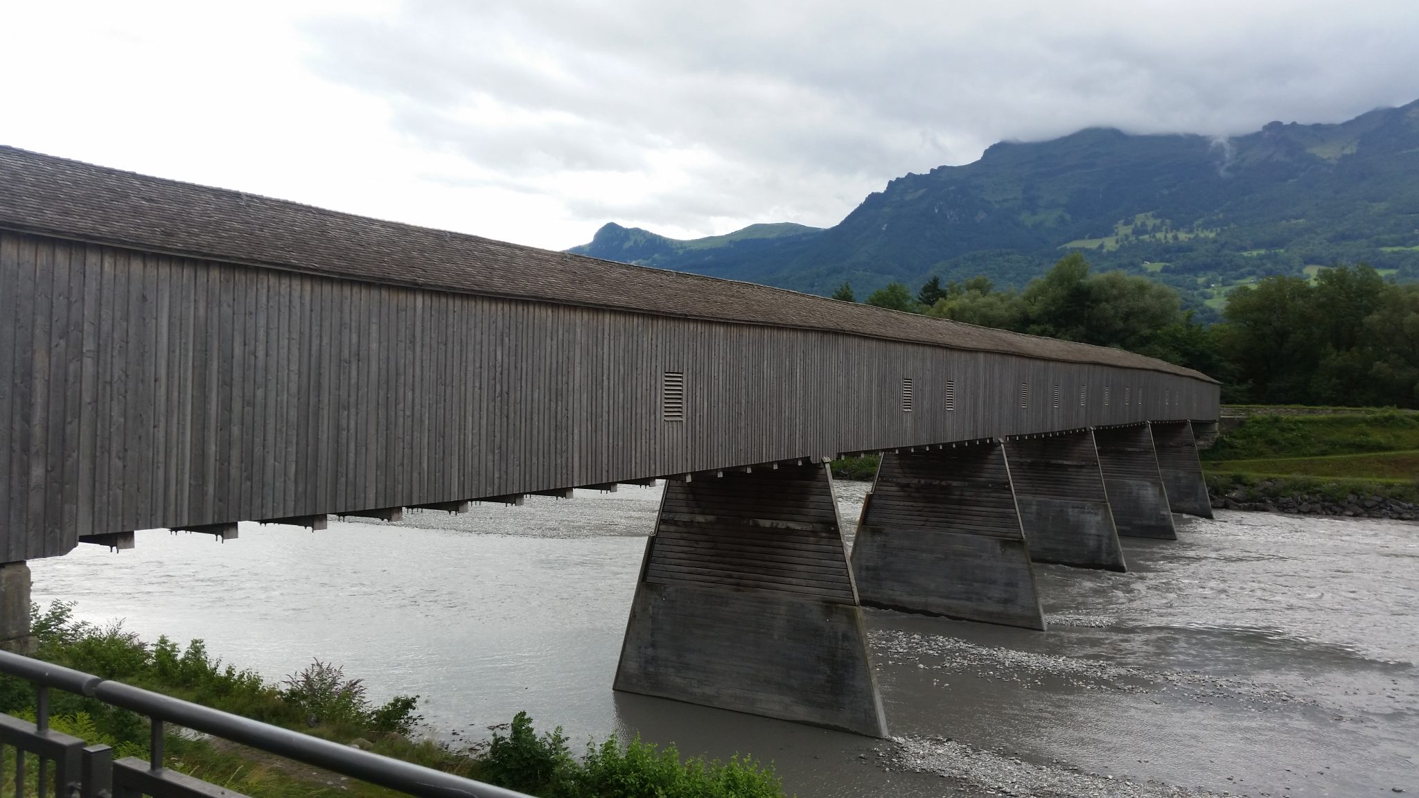 Pamiętam że Liechtenstein wydał mi się strasznie brzydki, ale może to efekt pogody, bo jak patrzę na zdjęcia które zrobiłem wtedy to przy ładnych warunkach musi prezentować się świetnie. Zwłaszcza góry wyglądają naprawdę pięknie, a gdzieniegdzie nawet majaczyły na nich w oddali jakieś zamki. Choć początkowo planowałem trochę zostać i pozwiedzać, to ostatecznie musiałem jechać dalej, bo dzień się już kończył, a na nocleg umówiłem się już w Szwajcarii. Szybko znalazłem się w dolinie Renu. Wzdłuż rzeki biegnie świetny szlak rowerowy, który pozwolił mi bezstresowo pokonać ostatnie kilometry. Po drodze spotkałem nawet kilku samotnych podróżników takich jak ja. Ciekawym pomysłem były mosty które były zadaszone na całej długości. Nie wiem czemu chciało im się to robić, ale bardzo mi to odpowiadało bo mogłem choć na chwilę odpocząć od ulewy. Granicę szwajcarską pokonałem bezproblemowo. Nie było nawet żadnej budki, tylko flagi obu państw powiewające na wichrze. Sporo się naczytałem o rozmaitych obostrzeniach, np. dotyczących wwozu żywności, jednak w praktyce nie miałem żadnych problemów, może to kwestia środka transportu.